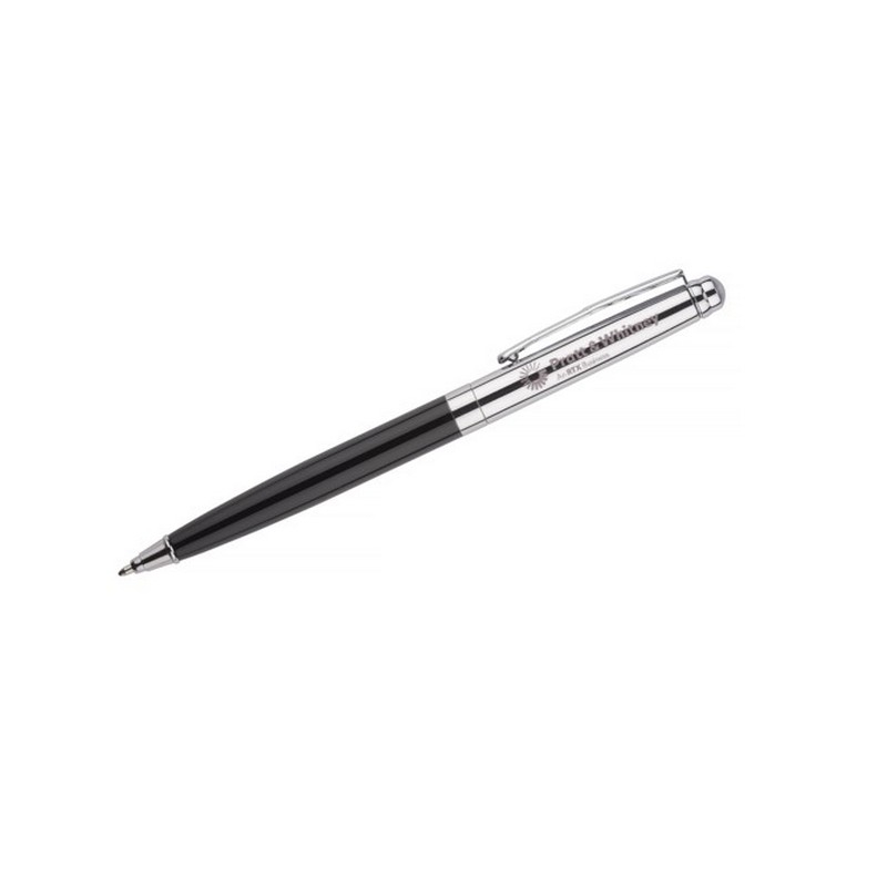 Metalowy długopis FRISO. Posiada mechanizm typu twist. Wkład w kolorze niebieskim. Znakowanie: logo grawer