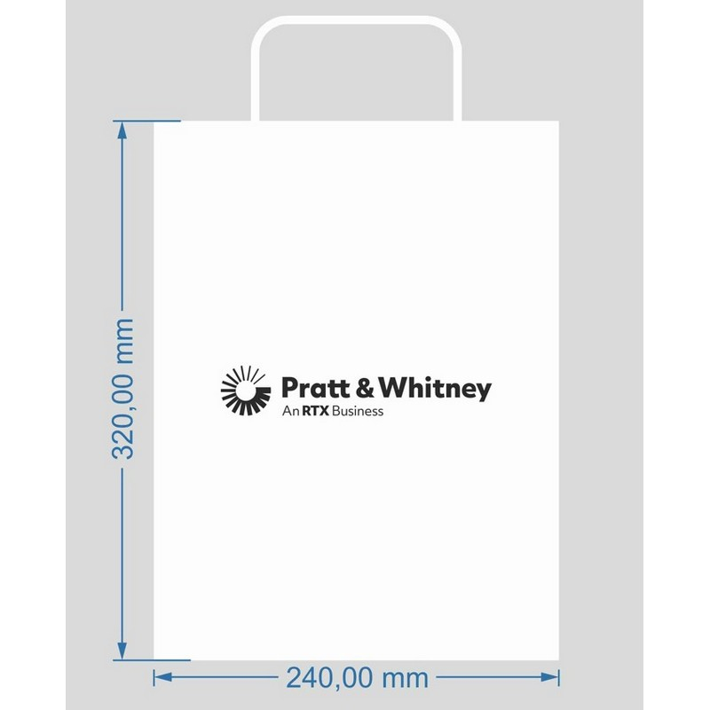 Torba papierowa biała, skręcane uszy. Wymiary: 24 x 32 cm. Znakowanie: nadruk logo 1 kolor, 1 strona